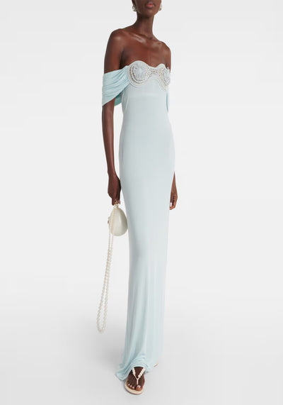 CROCHET-TRIMMED OFF-SHOULDER MAXI DRESS